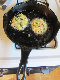 Add a veg ball to the hot oil and squish with a spatula until it's about a half-inch thick. If the oil bubbles all around the edges, you're set, add another and squish.